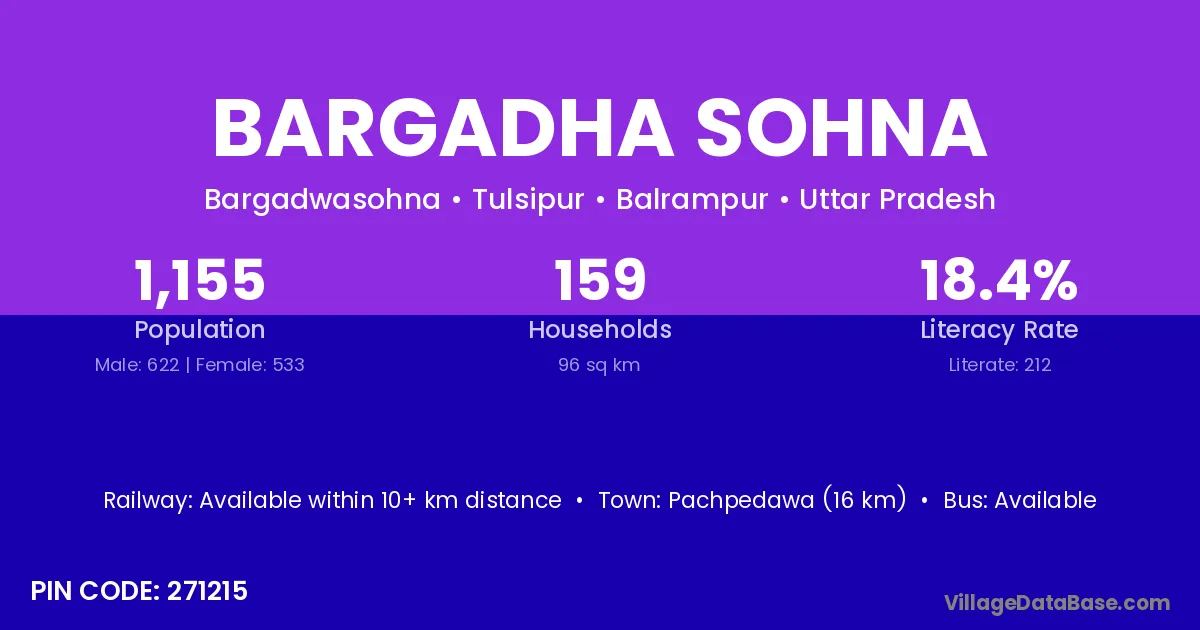 Pachpedawa (16 km) is the nearest town to Bargadha Sohna village for major economic activities and is located approximately 16 km away.