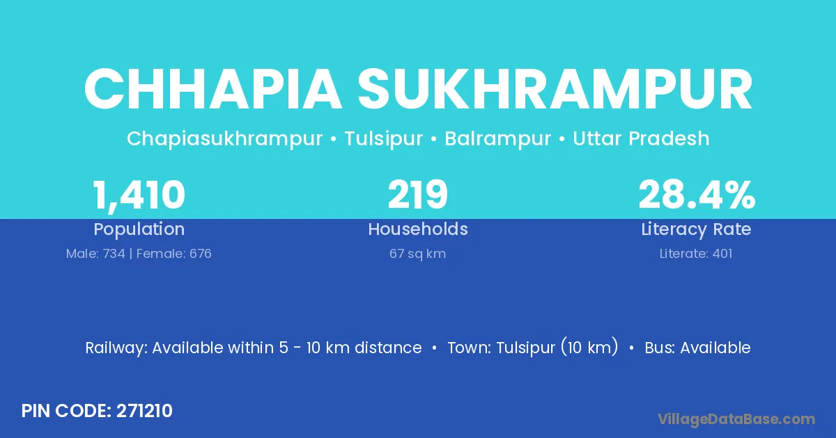 Tulsipur (10 km) is the nearest town to Chhapia Sukhrampur village for major economic activities and is located approximately 10 km away.