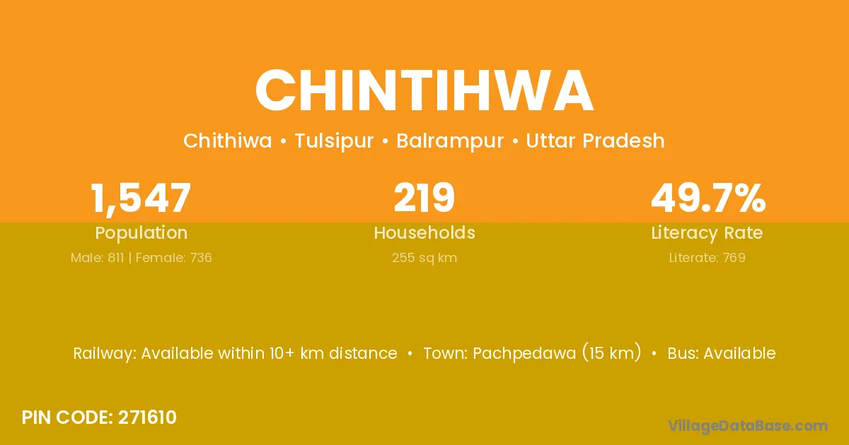 Pachpedawa (15 km) is the nearest town to Chintihwa village for major economic activities and is located approximately 15 km away.