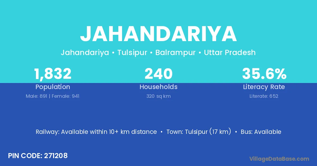 Tulsipur (17 km) is the nearest town to Jahandariya village for major economic activities and is located approximately 17 km away.