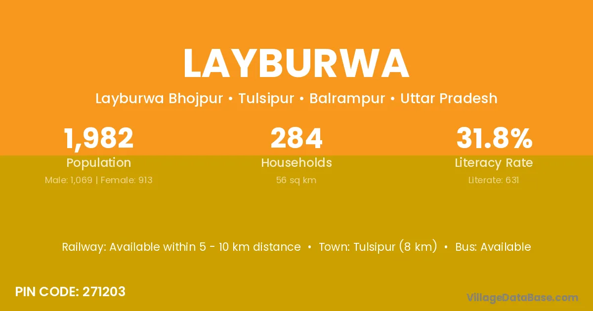 Tulsipur (8 km) is the nearest town to Layburwa village for major economic activities and is located approximately 8 km away.