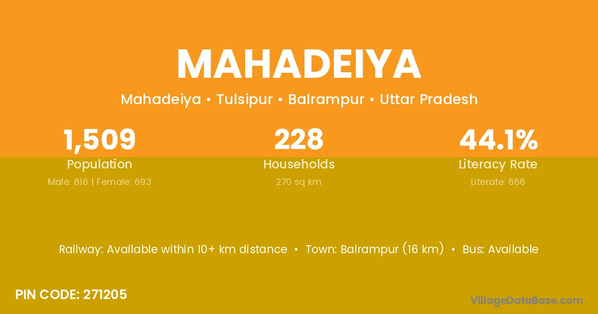 Balrampur (16 km) is the nearest town to Mahadeiya village for major economic activities and is located approximately 16 km away.
