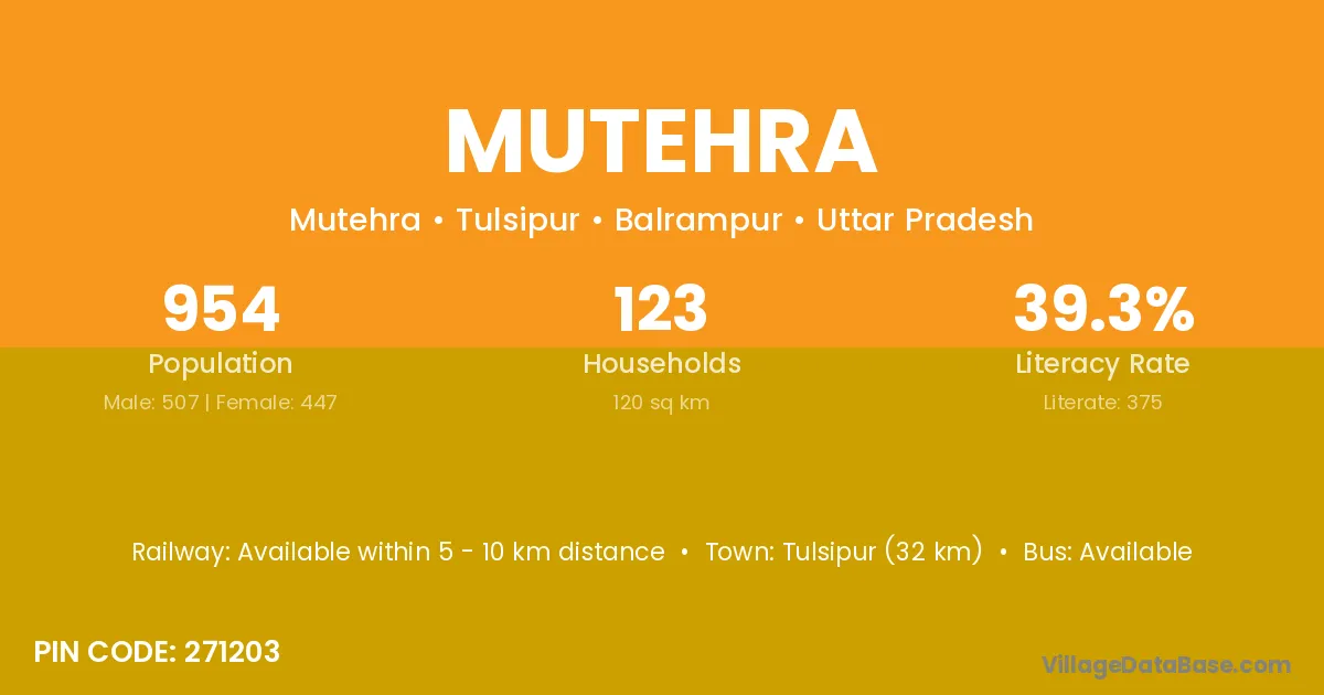 Tulsipur (32 km) is the nearest town to Mutehra village for major economic activities and is located approximately 32 km away.