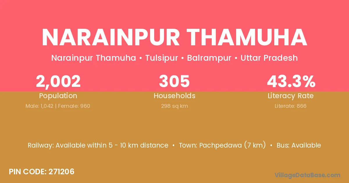 Narainpur Thamuha village has a total population of 2,002 people, of which 1,042 are males and 960 are females.