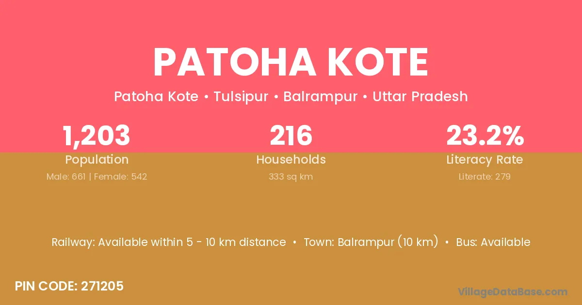 Balrampur (10 km) is the nearest town to Patoha Kote village for major economic activities and is located approximately 10 km away.