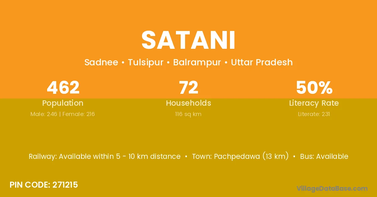 Satani village has a total population of 462 people, of which 246 are males and 216 are females.