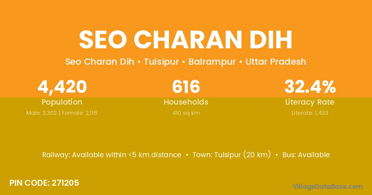 Tulsipur (20 km) is the nearest town to Seo Charan Dih village for major economic activities and is located approximately 20 km away.