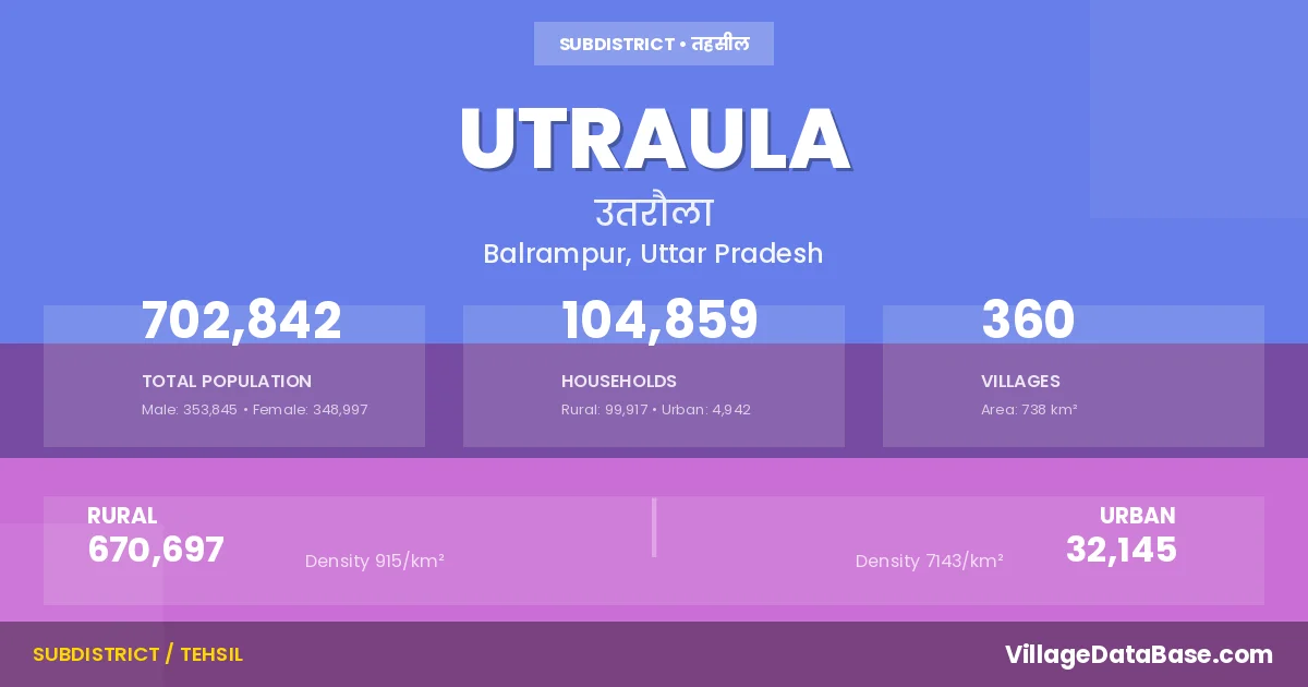 According to the 2011 census The total area of Utraula Tehsil is 738 km², with a population of 702842 people. The population density is 953 inhabitants per square kilometre, and there are approximately 104859 houses in the sub district.