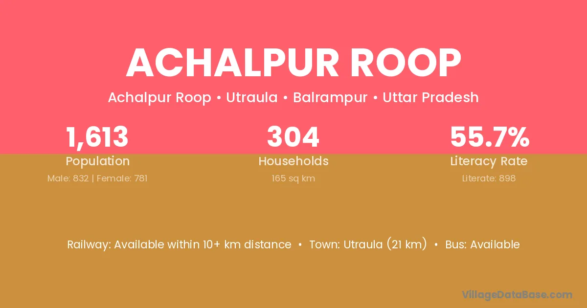Utraula (21 km) is the nearest town to Achalpur Roop village for major economic activities and is located approximately 21 km away.