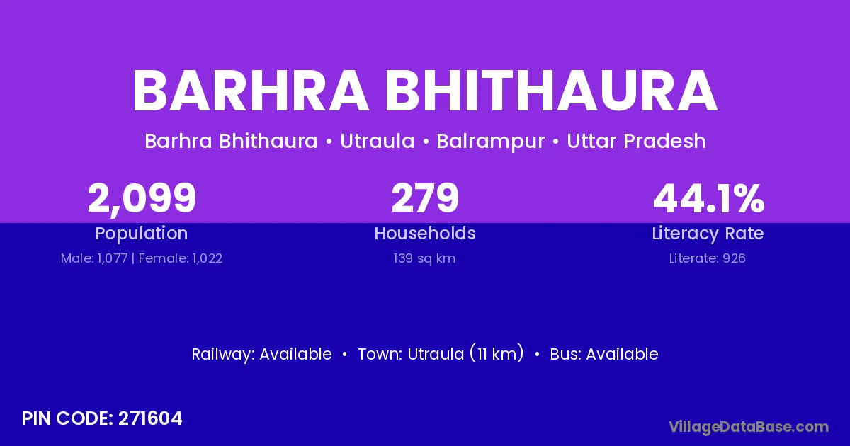 Utraula (11 km) is the nearest town to Barhra Bhithaura village for major economic activities and is located approximately 11 km away.