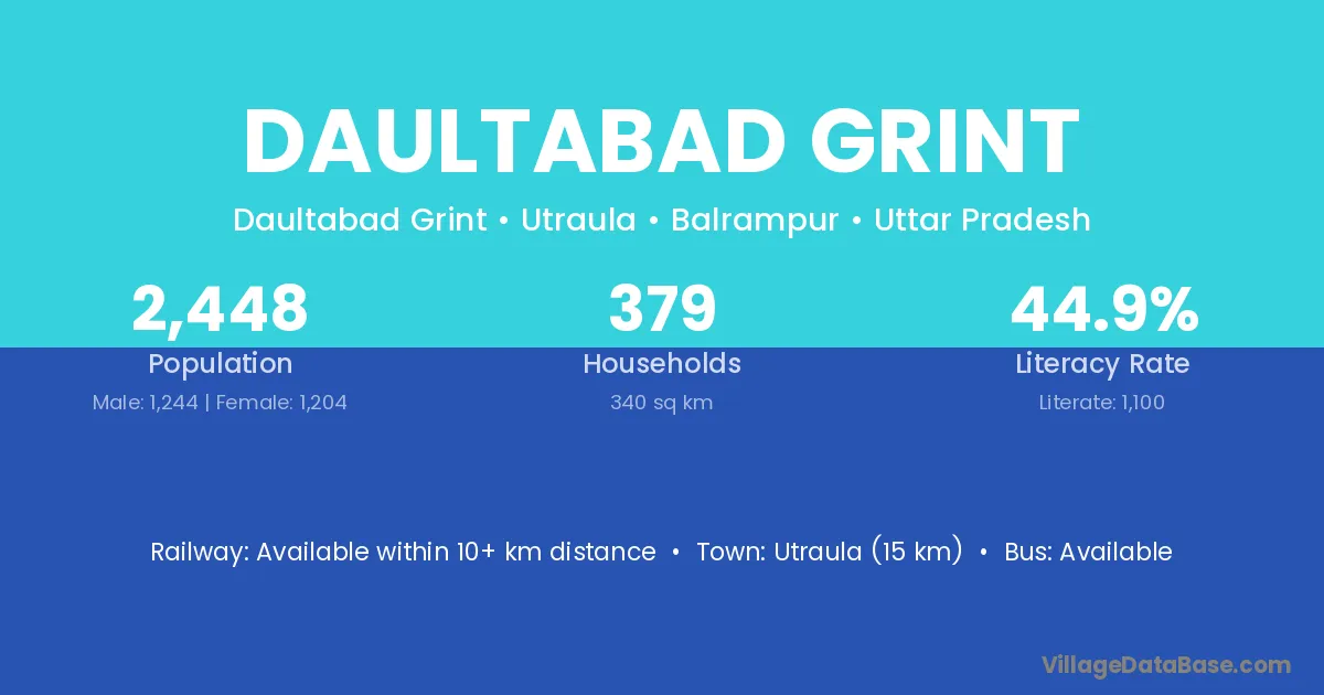 Utraula (15 km) is the nearest town to Daultabad Grint village for major economic activities and is located approximately 15 km away.
