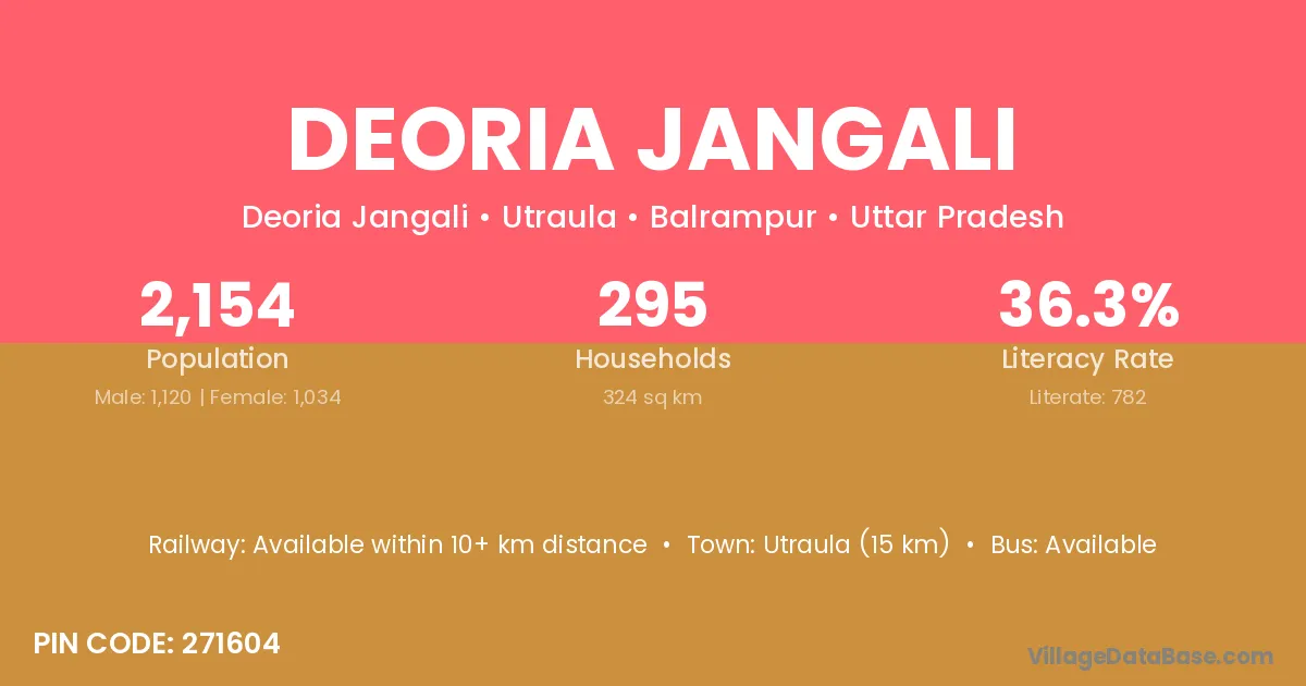 Utraula (15 km) is the nearest town to Deoria Jangali village for major economic activities and is located approximately 15 km away.