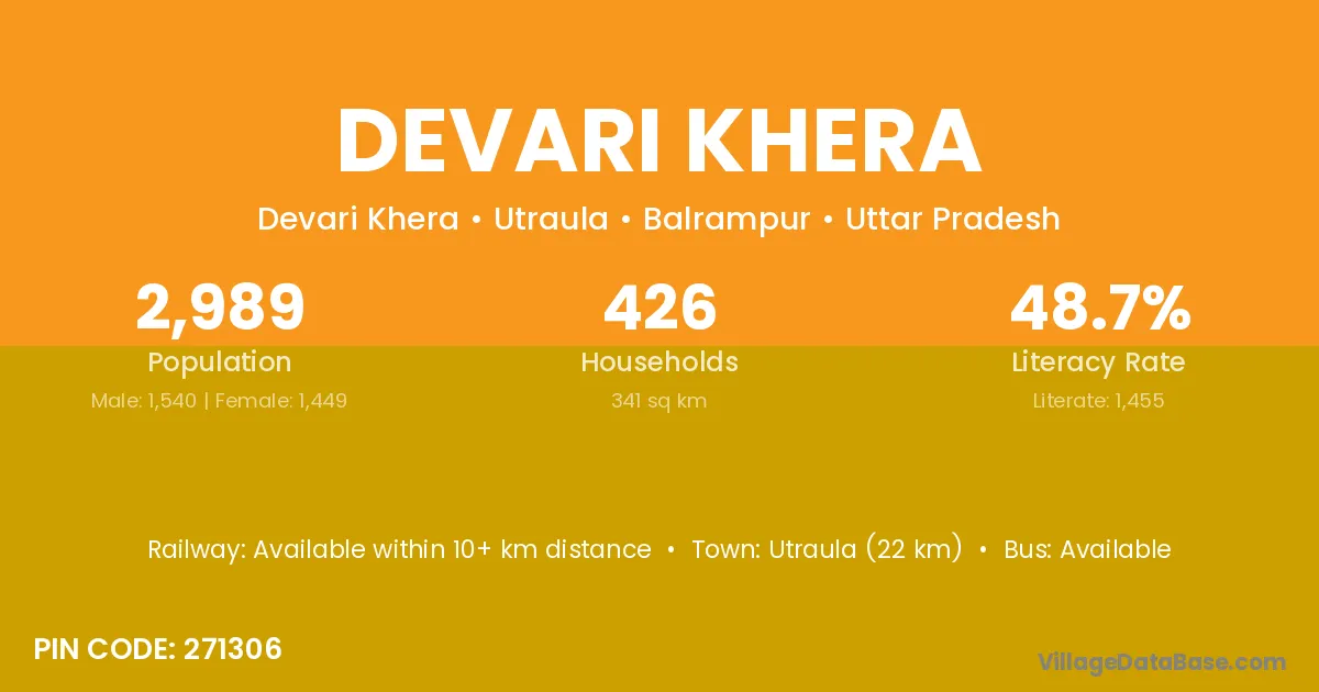Utraula (22 km) is the nearest town to Devari Khera village for major economic activities and is located approximately 22 km away.