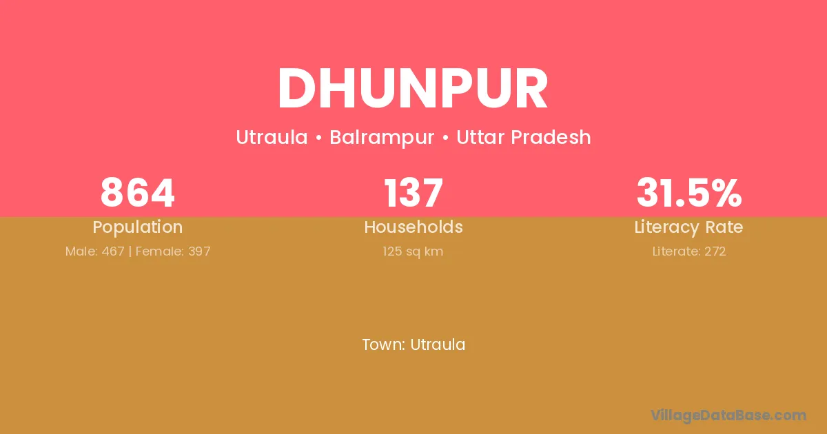 Dhunpur village has a total population of 864 people, of which 467 are males and 397 are females.