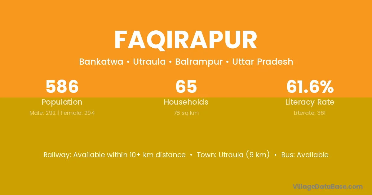 Utraula (9 km) is the nearest town to Faqirapur village for major economic activities and is located approximately 9 km away.