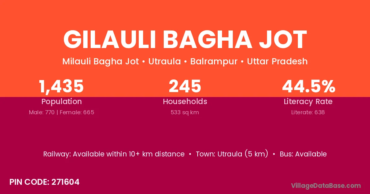 Utraula (5 km) is the nearest town to Gilauli Bagha Jot village for major economic activities and is located approximately 5 km away.