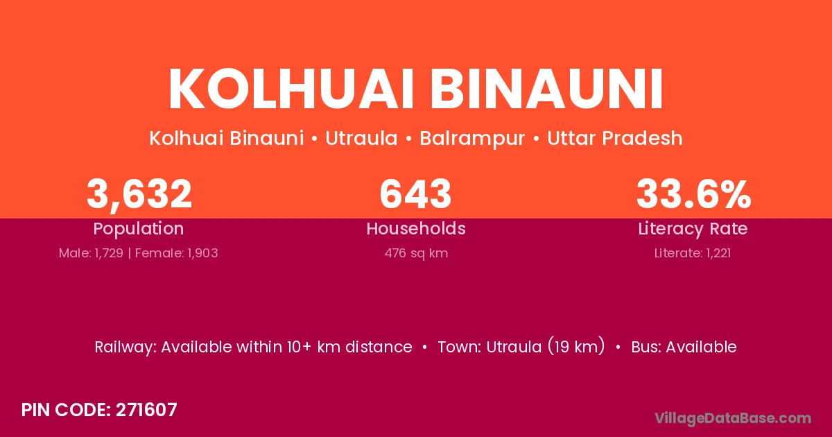 Utraula (19 km) is the nearest town to Kolhuai Binauni village for major economic activities and is located approximately 19 km away.