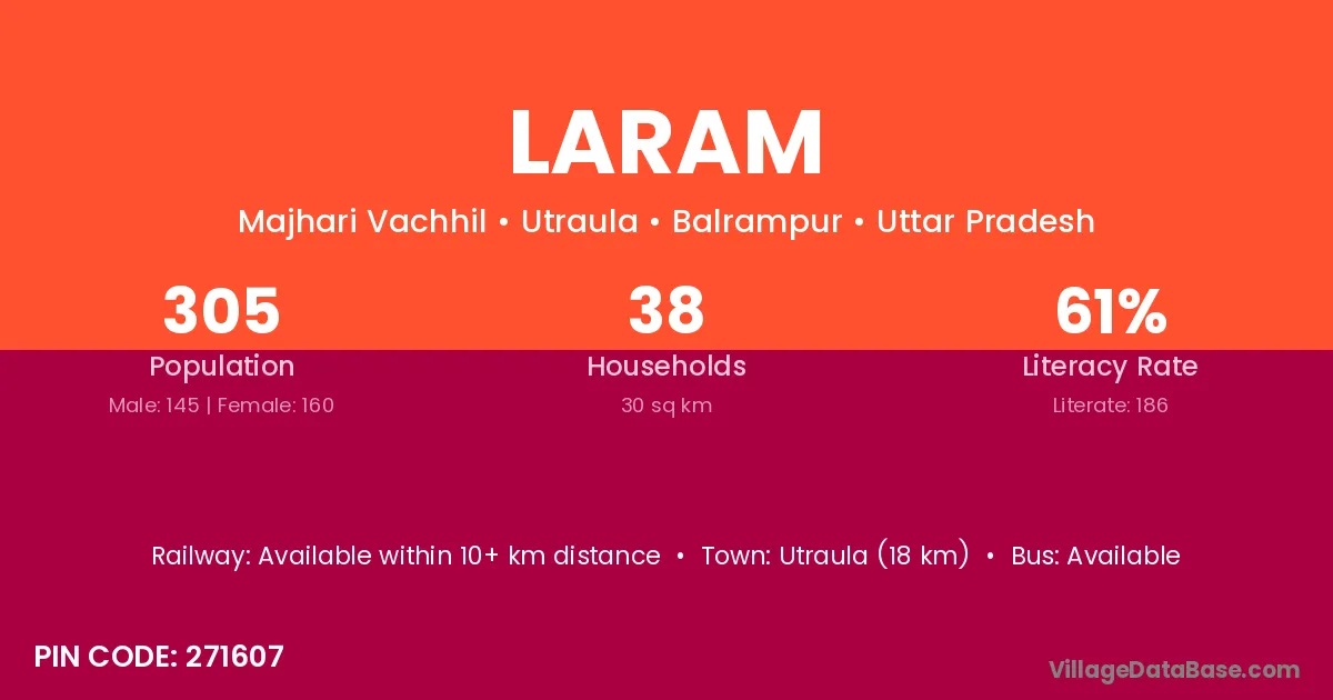 Utraula (18 km) is the nearest town to Laram village for major economic activities and is located approximately 18 km away.