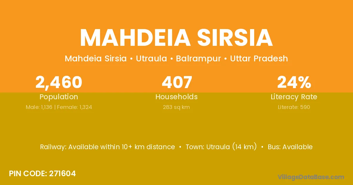 Utraula (14 km) is the nearest town to Mahdeia Sirsia village for major economic activities and is located approximately 14 km away.
