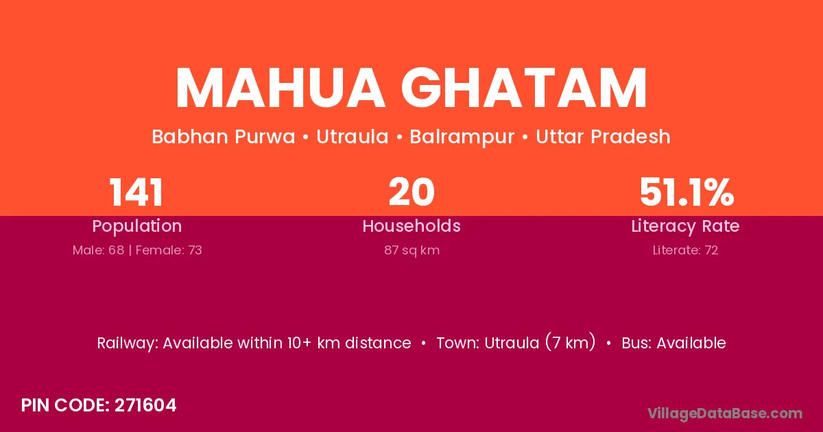 Utraula (7 km) is the nearest town to Mahua Ghatam village for major economic activities and is located approximately 7 km away.