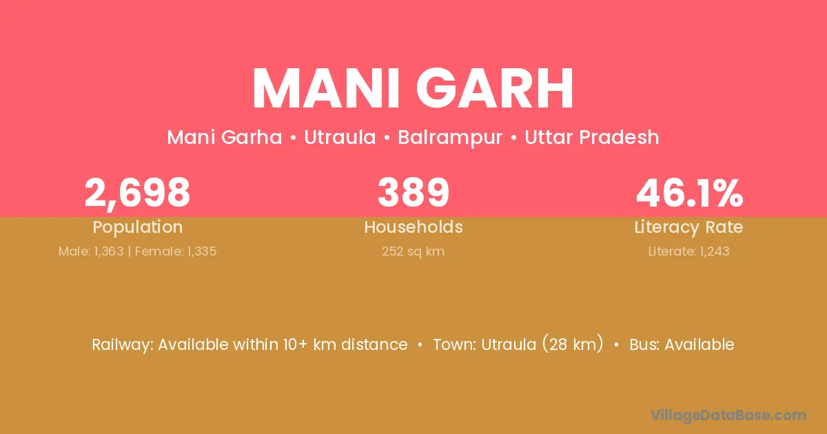 Utraula (28 km) is the nearest town to Mani Garh village for major economic activities and is located approximately 28 km away.