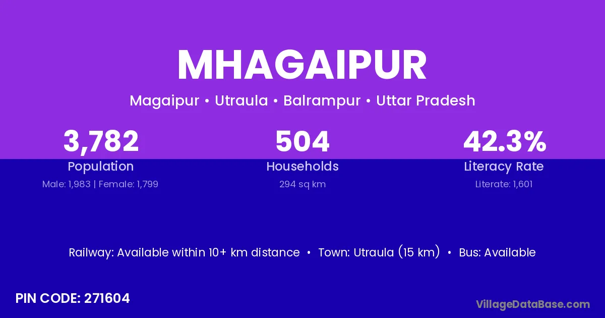 Utraula (15 km) is the nearest town to Mhagaipur village for major economic activities and is located approximately 15 km away.
