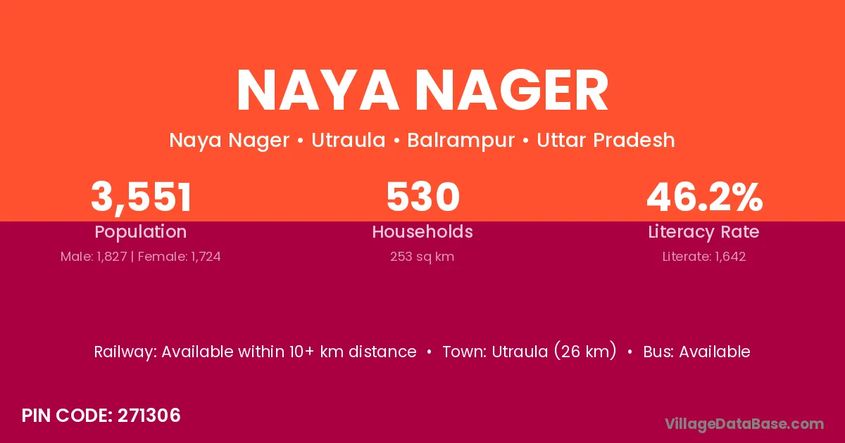 Utraula (26 km) is the nearest town to Naya Nager village for major economic activities and is located approximately 26 km away.