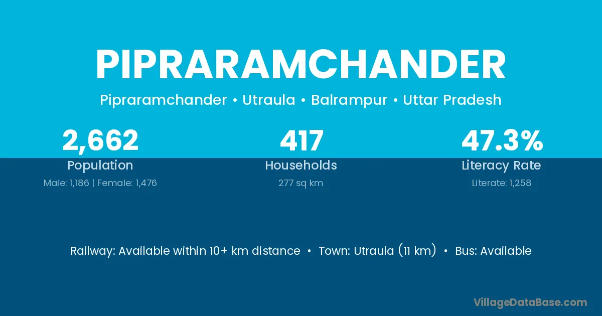 Utraula (11 km) is the nearest town to Pipraramchander village for major economic activities and is located approximately 11 km away.