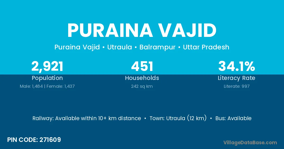 Utraula (12 km) is the nearest town to Puraina Vajid village for major economic activities and is located approximately 12 km away.