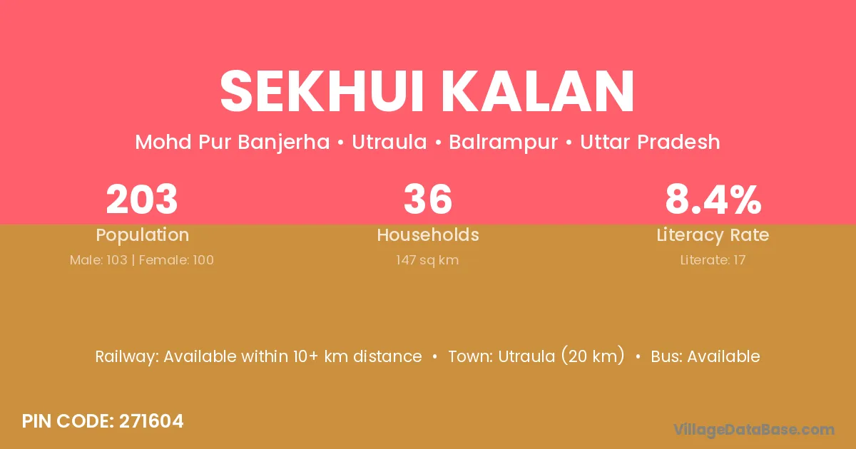 Utraula (20 km) is the nearest town to Sekhui Kalan village for major economic activities and is located approximately 20 km away.
