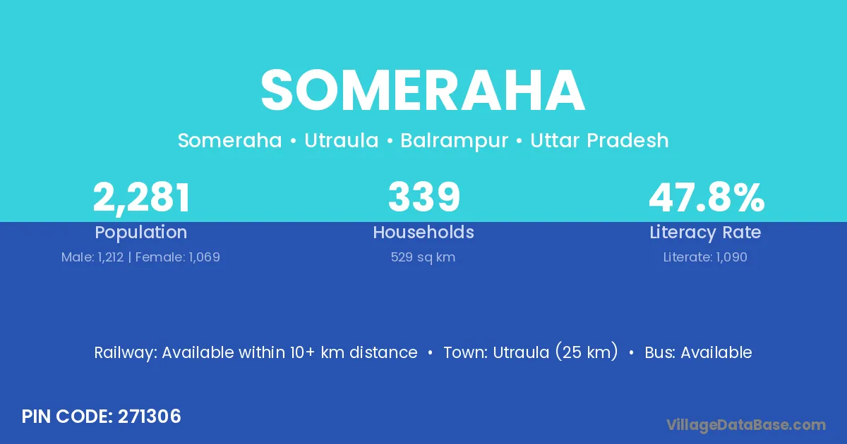 Utraula (25 km) is the nearest town to Someraha village for major economic activities and is located approximately 25 km away.