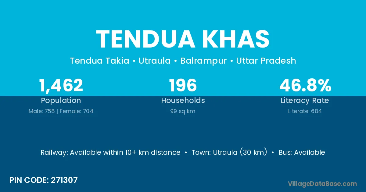 Utraula (30 km) is the nearest town to Tendua Khas village for major economic activities and is located approximately 30 km away.
