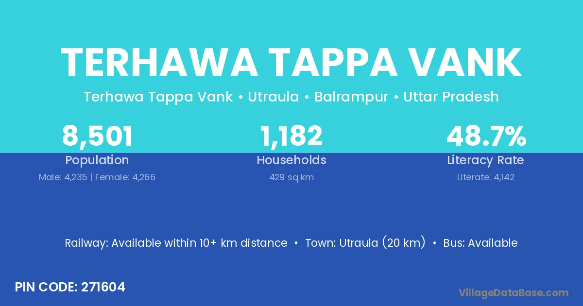 Utraula (20 km) is the nearest town to Terhawa Tappa Vank village for major economic activities and is located approximately 20 km away.