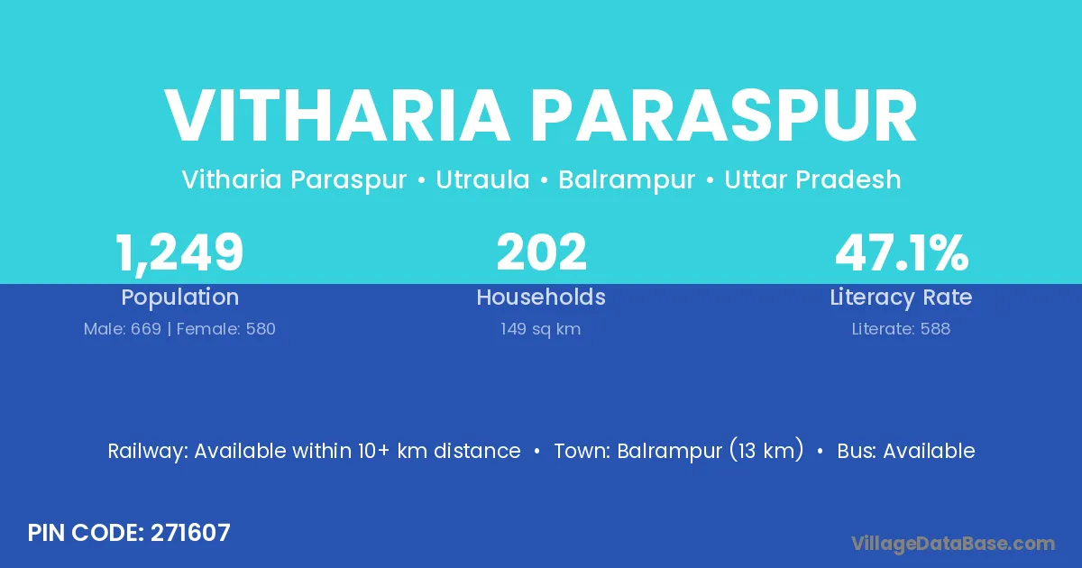 Balrampur (13 km) is the nearest town to Vitharia Paraspur village for major economic activities and is located approximately 13 km away.