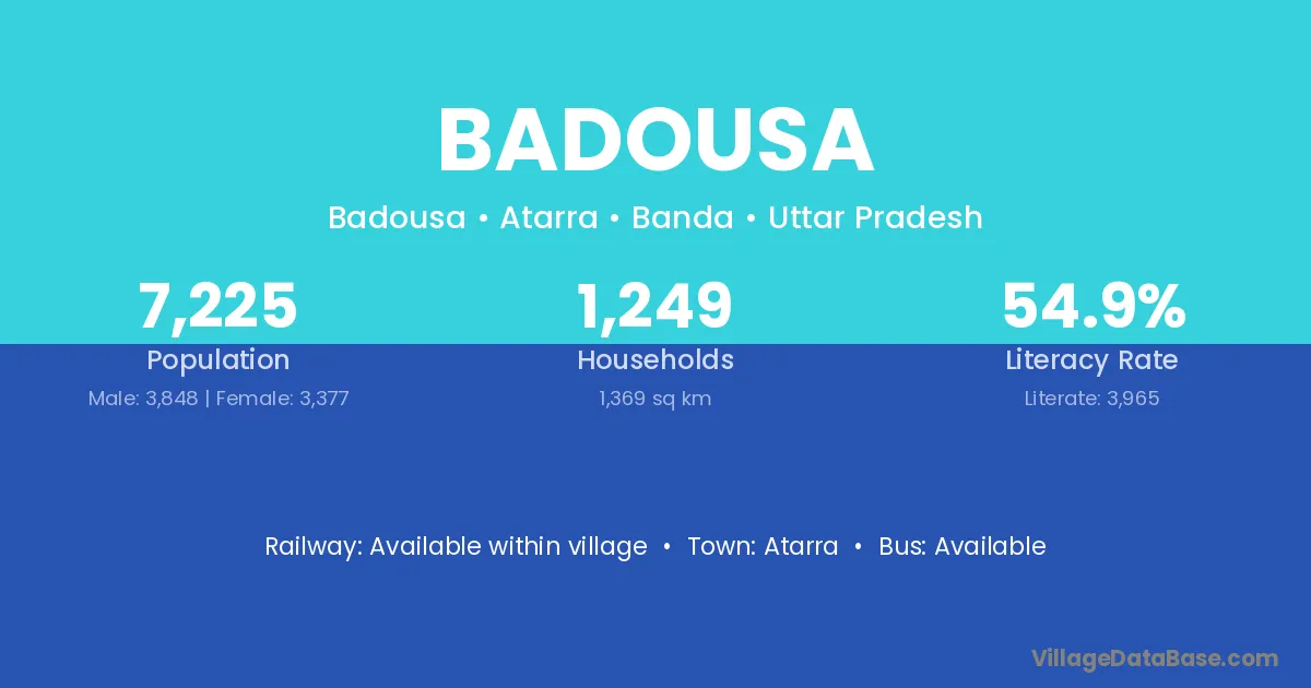 Badousa village has a total population of 7,225 people, of which 3,848 are males and 3,377 are females.