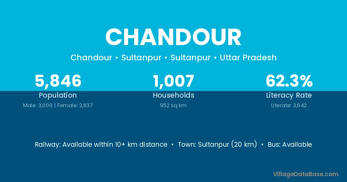 The literacy rate of Chandour village is 50.90%. Male literacy stands at 62.34% and female literacy at 37.81%.