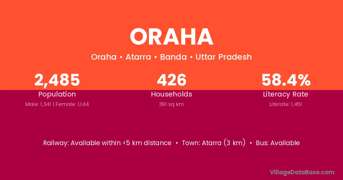 Oraha village has a total population of 2,485 people, of which 1,341 are males and 1,144 are females.