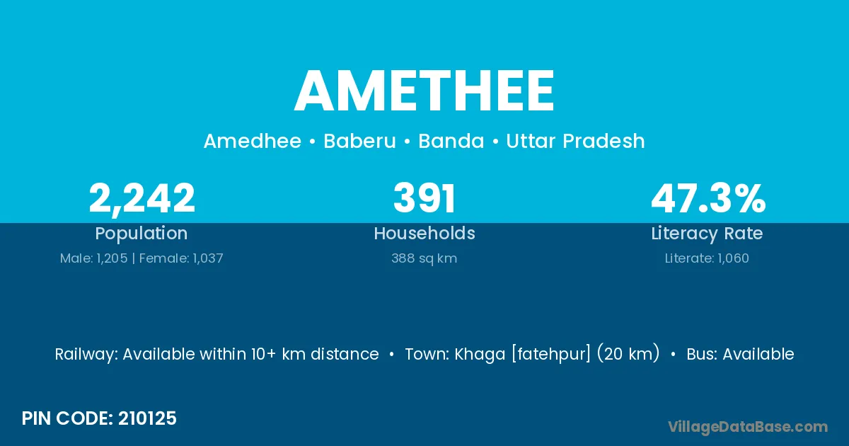 Khaga [fatehpur] (20 km) is the nearest town to Amethee village for major economic activities and is located approximately 20 km away.