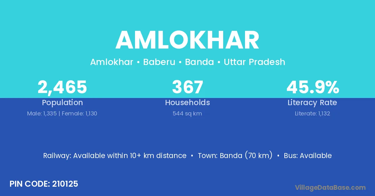 Banda (70 km) is the nearest town to Amlokhar village for major economic activities and is located approximately 70 km away.