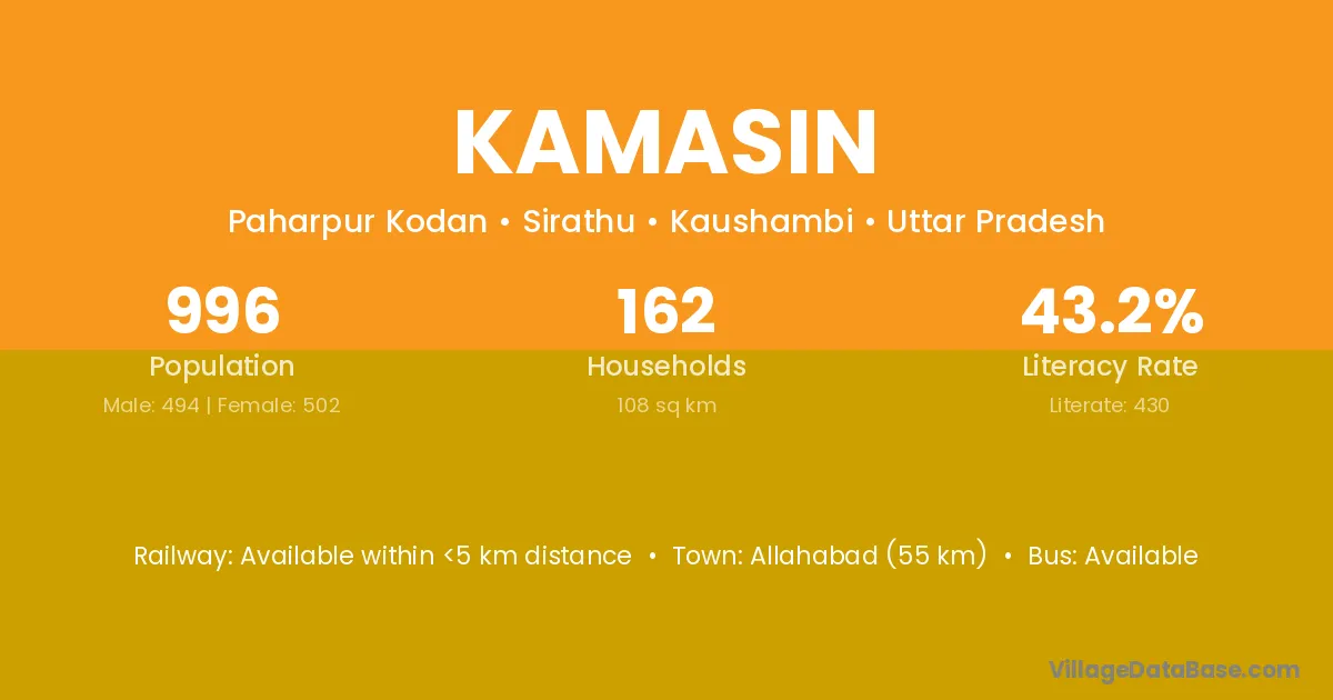 The literacy rate of Kamasin village is 54.31%. Male literacy stands at 63.57% and female literacy at 43.48%.