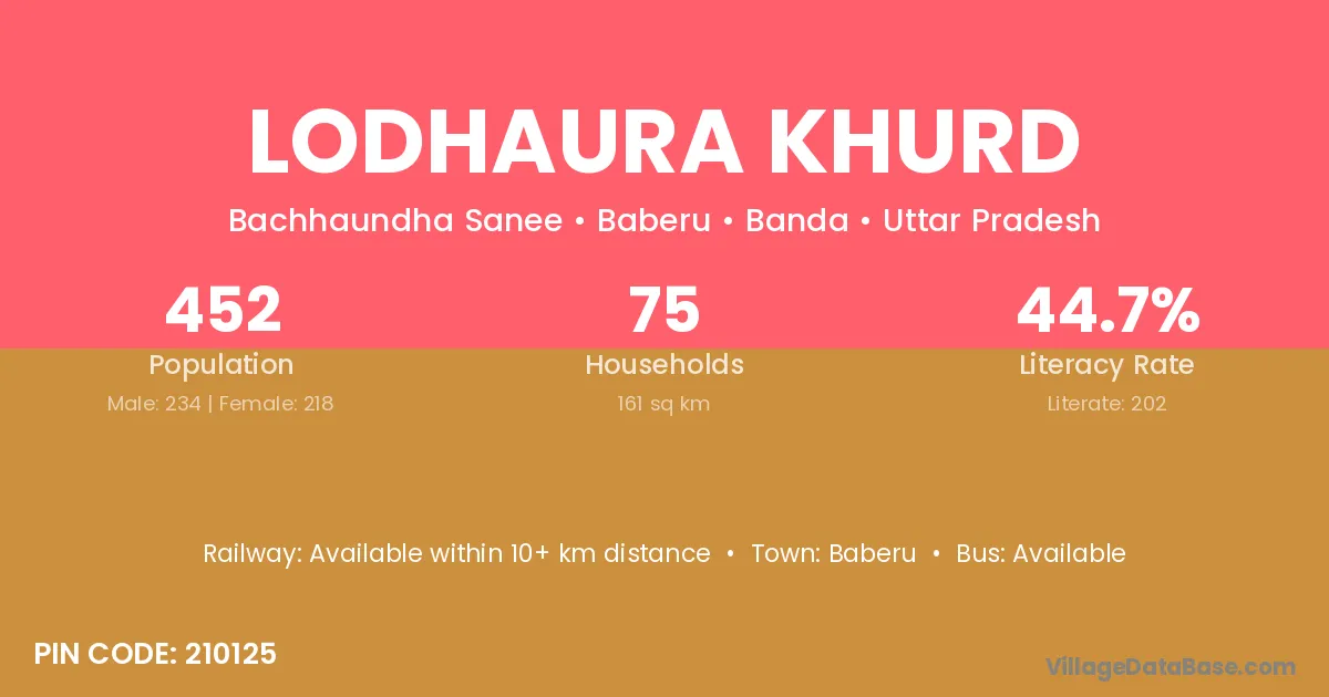 Lodhaura Khurd village has a total population of 452 people, of which 234 are males and 218 are females.