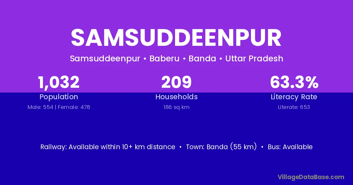 Banda (55 km) is the nearest town to Samsuddeenpur village for major economic activities and is located approximately 55 km away.