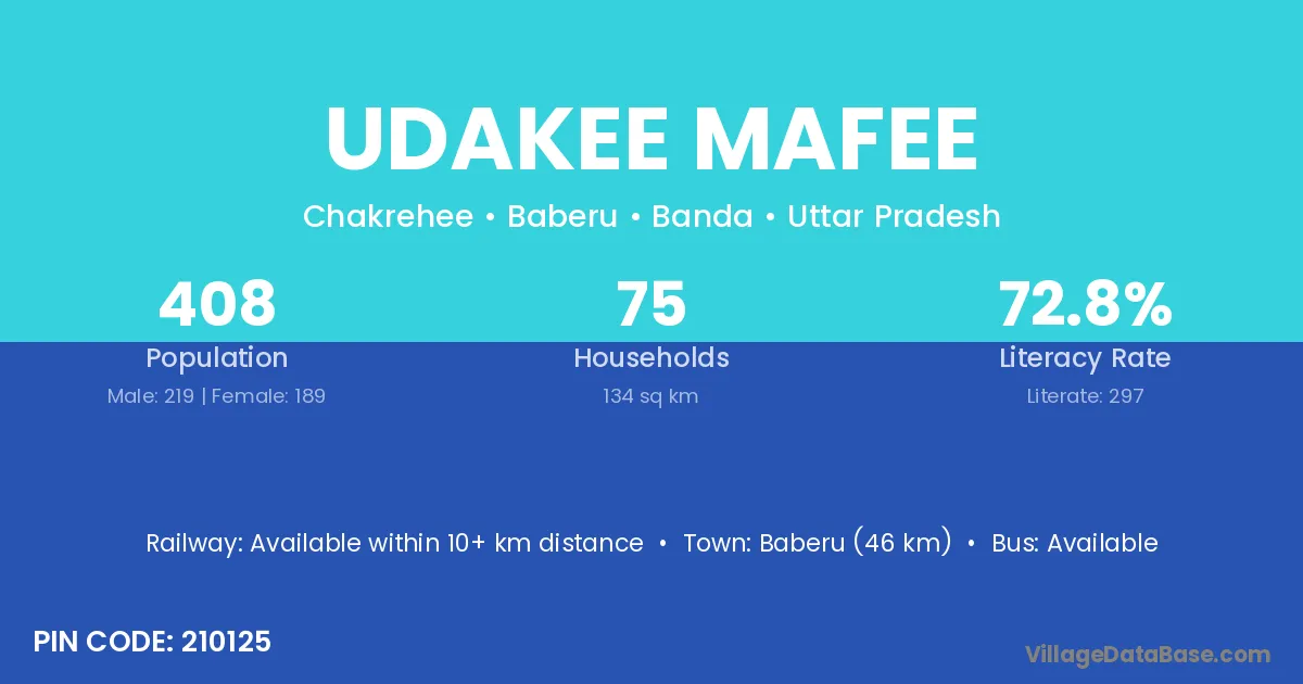 Baberu (46 km) is the nearest town to Udakee Mafee village for major economic activities and is located approximately 46 km away.