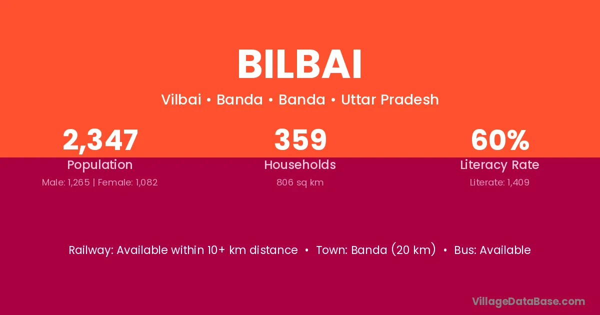 Banda (20 km) is the nearest town to Bilbai village for major economic activities and is located approximately 20 km away.