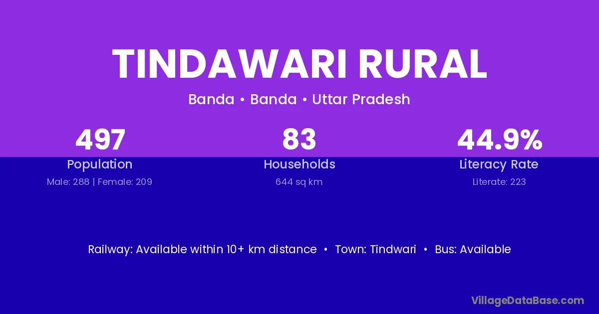 Tindawari Rural village has a total population of 497 people, of which 288 are males and 209 are females.