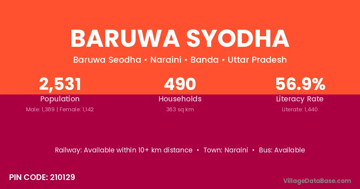Baruwa Syodha village has a total population of 2,531 people, of which 1,389 are males and 1,142 are females.