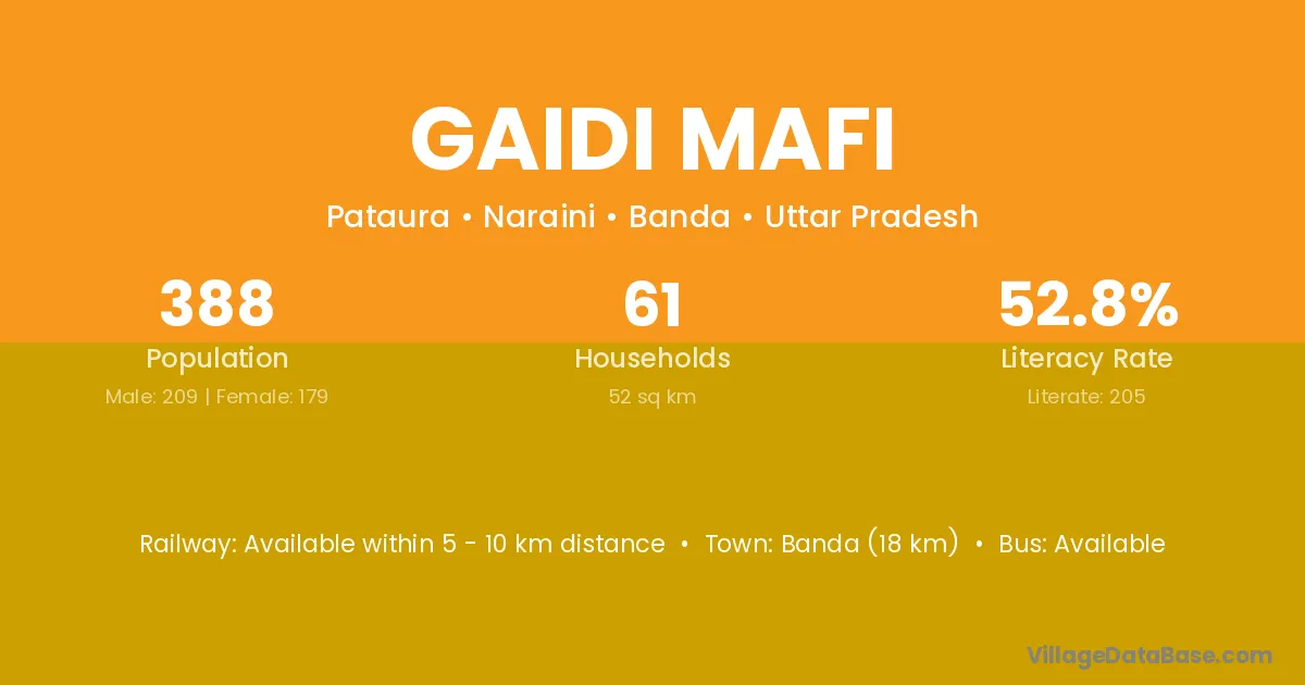 Banda (18 km) is the nearest town to Gaidi Mafi village for major economic activities and is located approximately 18 km away.