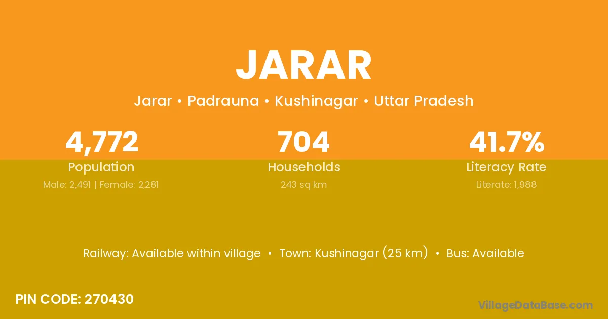 According to Census 2011 information, the village code of Jarar village is 210001.