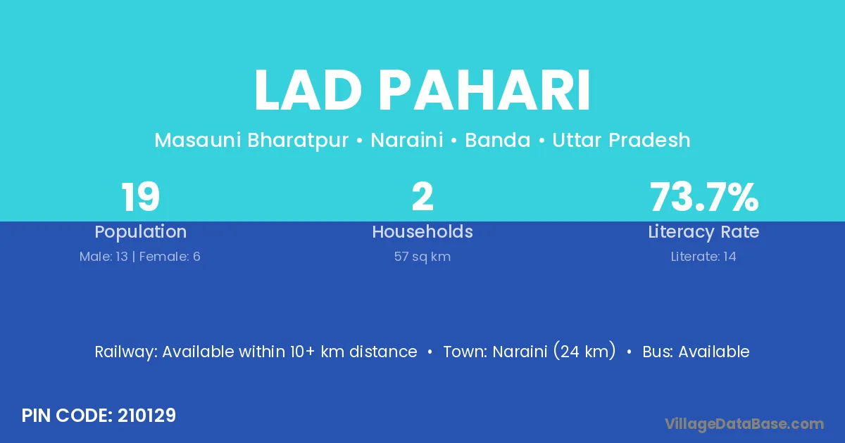 Naraini (24 km) is the nearest town to Lad Pahari village for major economic activities and is located approximately 24 km away.