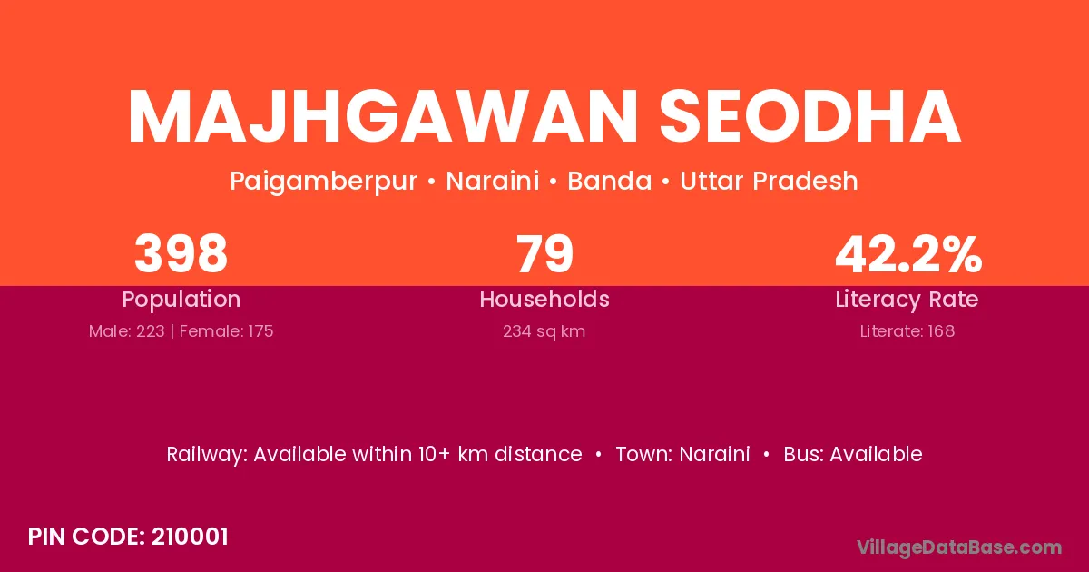 Majhgawan Seodha village has a total population of 398 people, of which 223 are males and 175 are females.